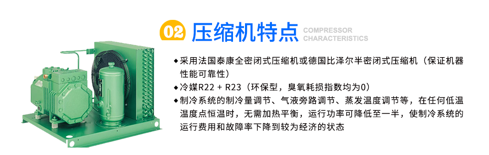 壓縮機: 1,采用法國泰康全密閉式壓縮機或德國比澤爾半密閉式壓縮機(保證機器性能可靠性) 2,冷媒R22 + R23(環(huán)保型,臭氧耗損指數(shù)均為0) 3,制冷系統(tǒng)的制冷量調(diào)節(jié)、氣液旁路...
